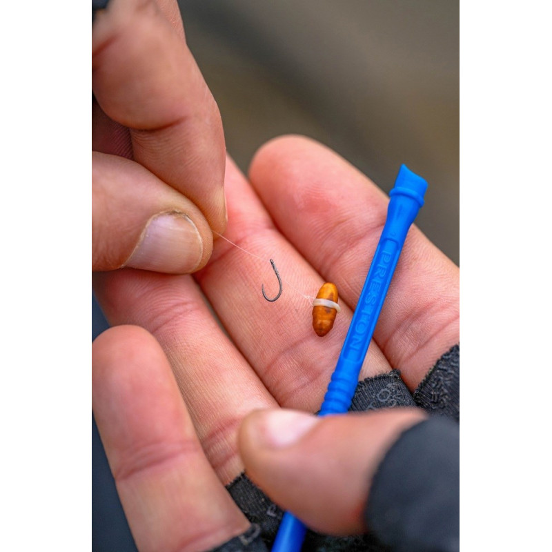 Navlékač gumiček je vybaven prohlubní, do které se zasunou nástrahy, jako jsou kukly nebo 4mm pelety, a gumička se pak snadno nasune na nástrahu.