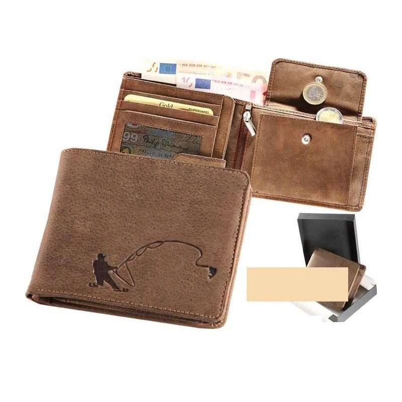 Kožená peněženka s motivy ryb v provedení na výšku a šířku.