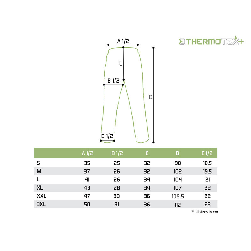 Barevně jsou kalhoty ThermoTEX Plus+ laděny do tmavé zelené a černé barvy se zářivě žlutými prvky, čímž se stanou nejen užitečnou a vysoce funkční, ale také pěknou součástí vašeho outfitu.