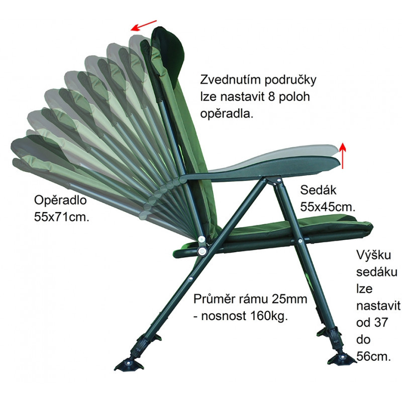Pohodlné a exkluzivní rybářské křeslo v CAMO provedení s anatomicky tvarovanou matrací s micro fleece. Opěradlo má pohodlný polštář a na bocích matrace je lem camo 600D oxford, chránící před větrem a zimou. Konstrukce křesla je ocelová o tloušťce stěny 2mm a velmi jednoduchá, pevná s nosností až 160kg, jeho rozložení či složení je otázkou několika vteřin. Pevné područky slouží k naklápění opěradla při jejich nadzdvižení (8 poloh). Teleskopické nohy jsou vybaveny spolehlivou aretací a protiskluzovými packami proti zaboření. Výška sedáku 40 - 56 cm bude pro mnohé velkou výhodou, při častém vstávání k prutům.