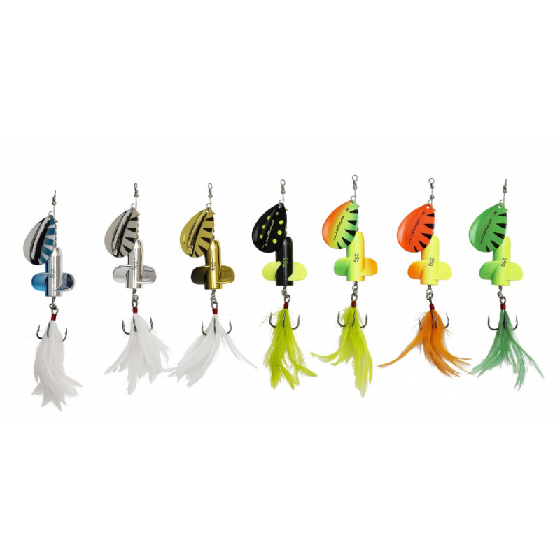 Umělá nástraha Dam Effzett Rattlin Spinner je rotační třpytka, která kromě rotujícího plíšku má rotující střed a háček schovaný v chomáčku peří. Tato kombinace je velice lákavá pro dravé ryby.