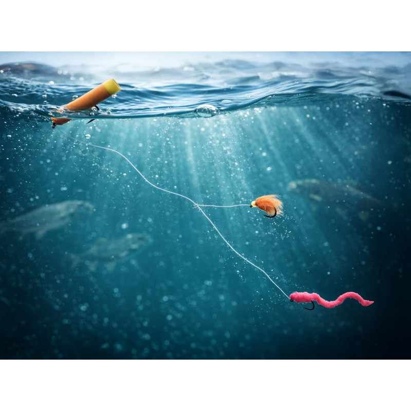 Sada obsahuje také pěnovou mušku která slouží jako plovoucí indikátor záběru. Tato se navazuje jako první v pořadí od šňůry a slouží jako plovák pro podvěšení ostatních zatížených mušek. Při lovu s více muškami doporučujeme rozestup alespoň 50cm pro pokrytí různých vrstev vodního sloupce.