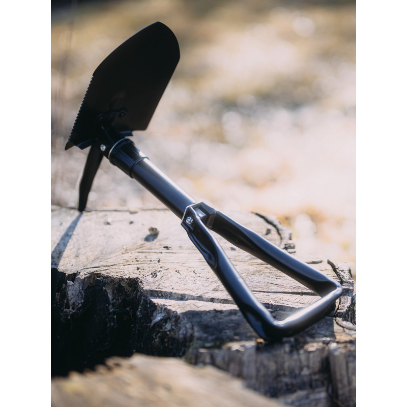 Všestranná skládací lopatka z ocelo-uhlíkové konstrukce se šroubovací hlavicí pro bezpečné uzamčení při používání.